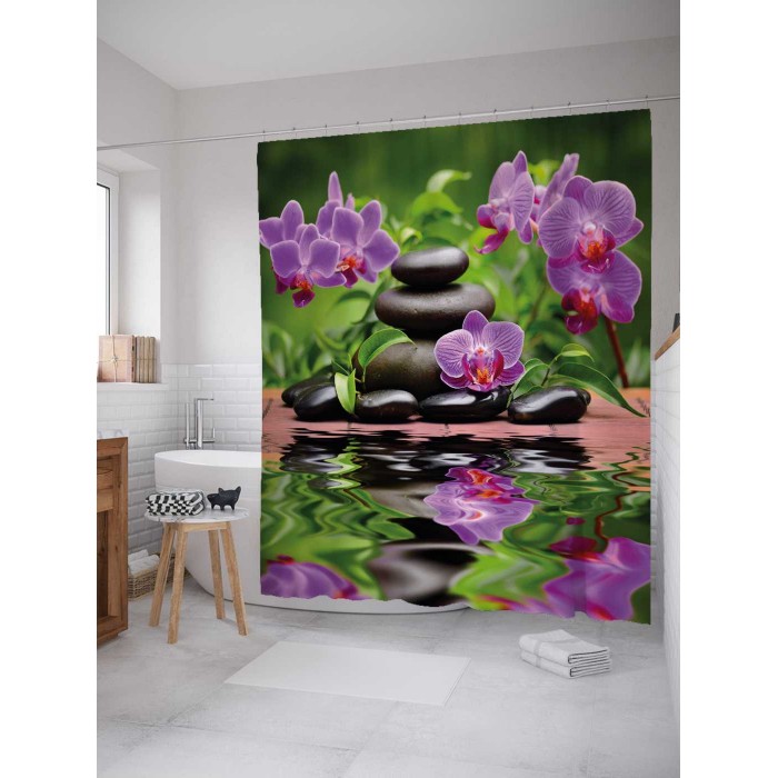 Шторка-занавеска для ванной JOYARTY Штора для ванной Орхидеи на камнях 180х200 см