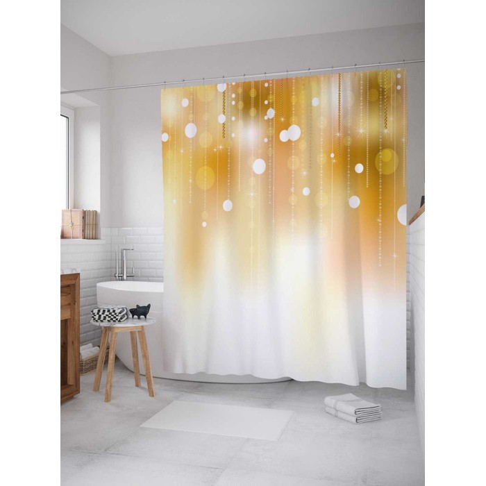 Красиво декорированная шторка, защищающая пол и оборудование ванной комнаты от брызг воды, изготовлена из полиэстера и обладает выраженными водоотталкивающими свойствами.