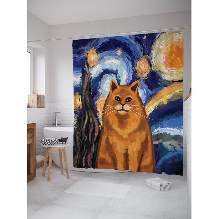 Шторка-занавеска для ванной JOYARTY Штора занавеска из сатена с крючками Звездная ночь и котик 200х180 см (размер: 180х200)