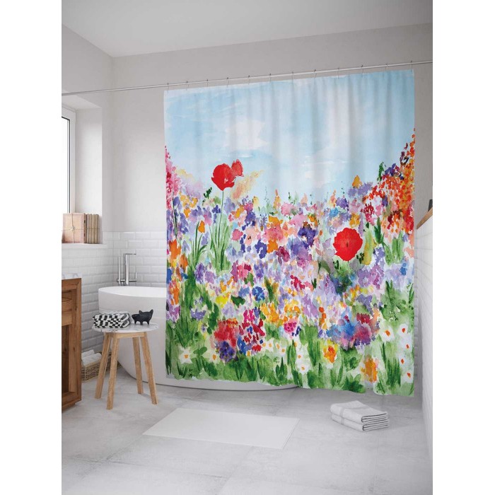 Красиво декорированная шторка, защищающая пол и оборудование ванной комнаты от брызг воды, изготовлена из полиэстера и обладает выраженными водоотталкивающими свойствами.