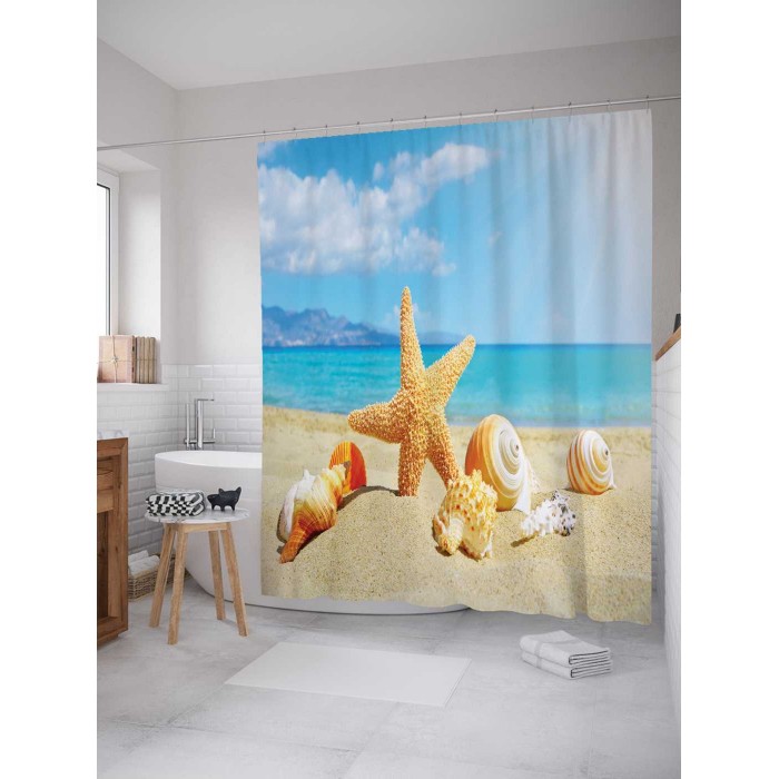 Красиво декорированная шторка, защищающая пол и оборудование ванной комнаты от брызг воды, изготовлена из полиэстера и обладает выраженными водоотталкивающими свойствами.