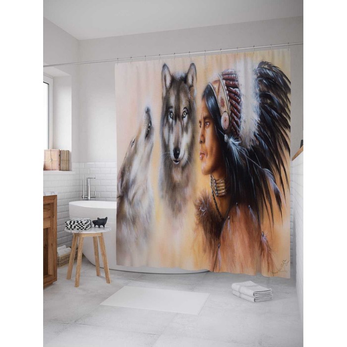 Шторка-занавеска для ванной JOYARTY Штора занавеска из сатена с крючками Индеец с волками 200х180 см (размер: 180х200)