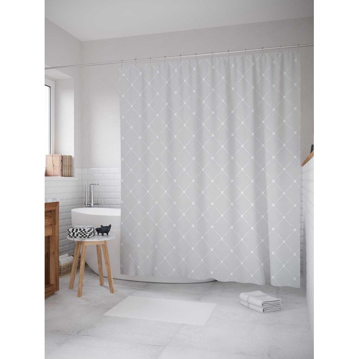 Красиво декорированная шторка, защищающая пол и оборудование ванной комнаты от брызг воды, изготовлена из полиэстера и обладает выраженными водоотталкивающими свойствами.