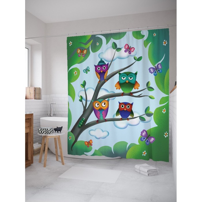Шторка-занавеска для ванной JOYARTY Штора занавеска из сатена с крючками Совы на ветках 200х180 см (размер: 180х200)
