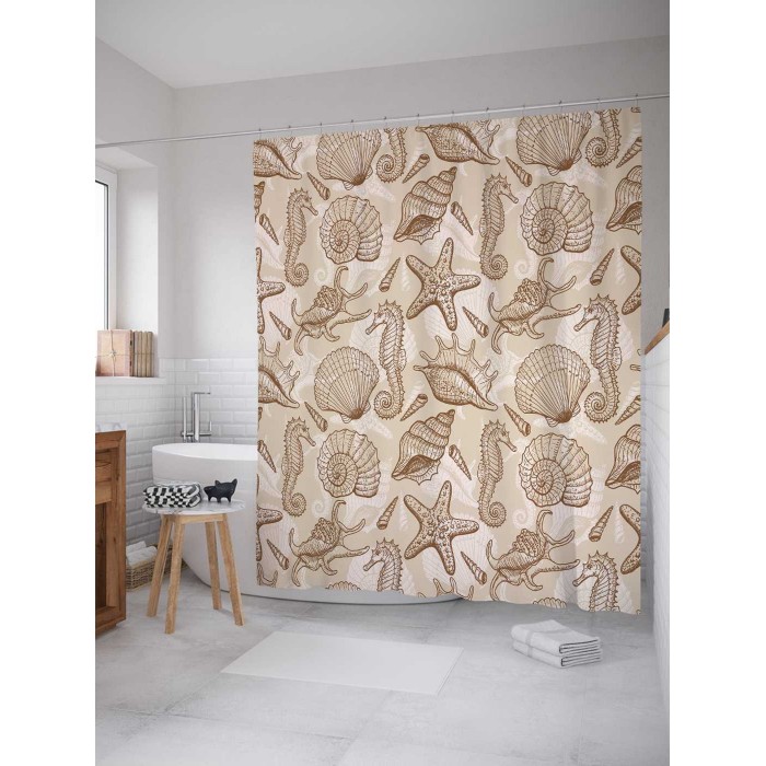 Красиво декорированная шторка, защищающая пол и оборудование ванной комнаты от брызг воды, изготовлена из полиэстера и обладает выраженными водоотталкивающими свойствами.