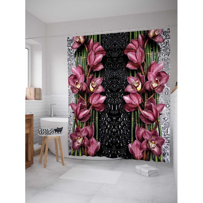 Красиво декорированная шторка, защищающая пол и оборудование ванной комнаты от брызг воды, изготовлена из полиэстера и обладает выраженными водоотталкивающими свойствами.