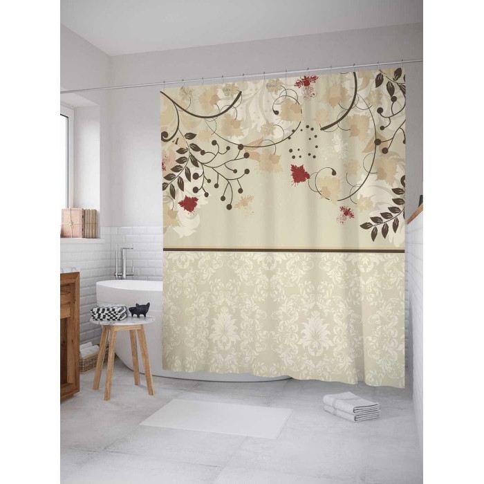 Красиво декорированная шторка, защищающая пол и оборудование ванной комнаты от брызг воды, изготовлена из полиэстера и обладает выраженными водоотталкивающими свойствами. Занавеска для ванной 180х200 комплектуется 12 прочными крючками из пластика и имеет в верхней части столько же обработанных на оверлоке отверстий. Декоративный рисунок нанесен на поверхность ткани при помощи фотопечати. Такие принты не боятся влаги и не смываются даже очень горячей водой.