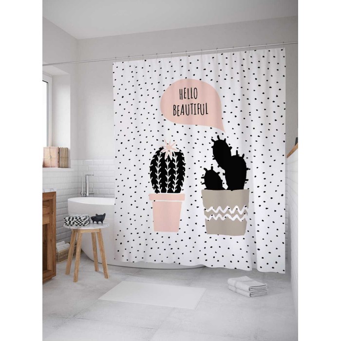 - Модель: Штора-занавеска для ванной из сатена с крючками Влюбленный кактус 200х180 см