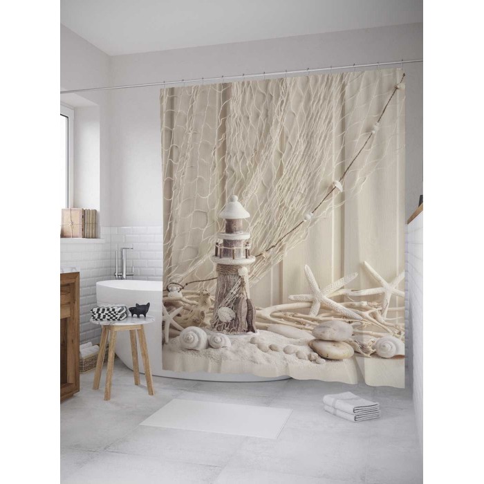 Шторка-занавеска для ванной JOYARTY Штора-занавеска для ванной из сатена с крючками Маяк с декорациями 200х180 см (размер: 180х200)