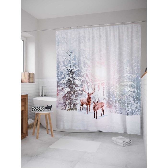 - Модель: Штора-занавеска для ванной из сатена с крючками Олени в снегу 200х180 см