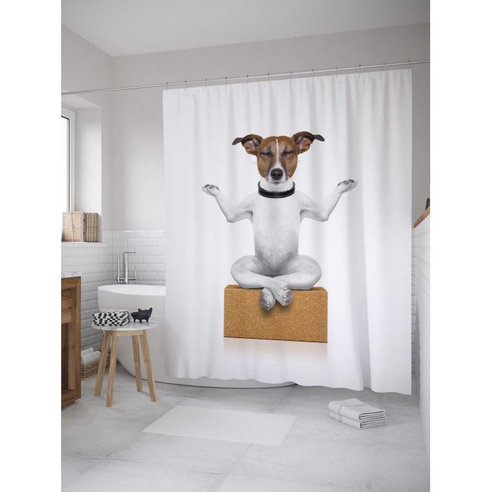 - Модель: Штора-занавеска для ванной из сатена с крючками Медитирующий пес 200х180 см