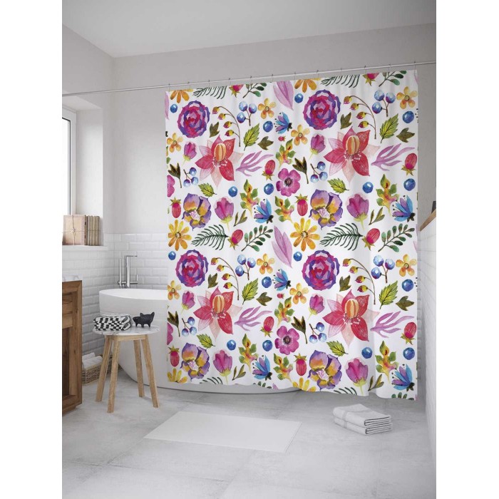 Красиво декорированная шторка, защищающая пол и оборудование ванной комнаты от брызг воды, изготовлена из полиэстера и обладает выраженными водоотталкивающими свойствами. Занавеска для ванной 180х200 комплектуется 12 прочными крючками из пластика и имеет в верхней части столько же обработанных на оверлоке отверстий. Декоративный рисунок нанесен на поверхность ткани при помощи фотопечати.