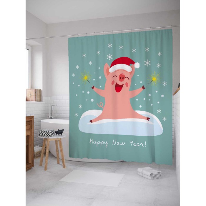 - Модель: Штора-занавеска для ванной из сатена с крючками Счастливая свинка 200х180 см