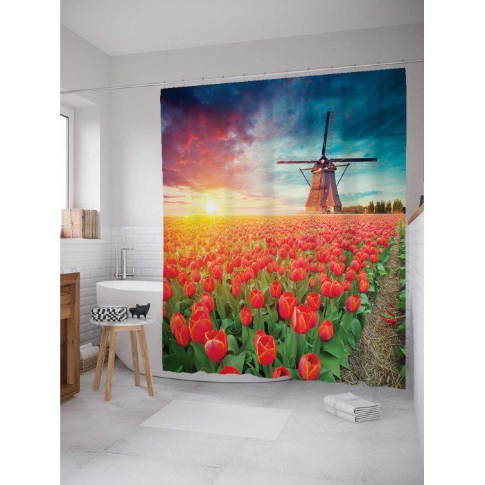 - Модель: Штора-занавеска для ванной из сатена с крючками Мельница на поле тюльпанов 200х180 см