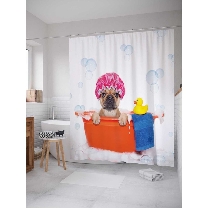 - Модель: Штора-занавеска для ванной из сатена с крючками Пес в ванной 200х180 см