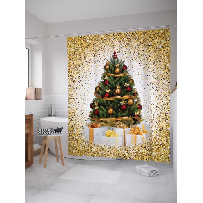 Шторка-занавеска для ванной JOYARTY Штора-занавеска для ванной из сатена с крючками Ёлка в конфетти 200х180 см (размер: 180х200)