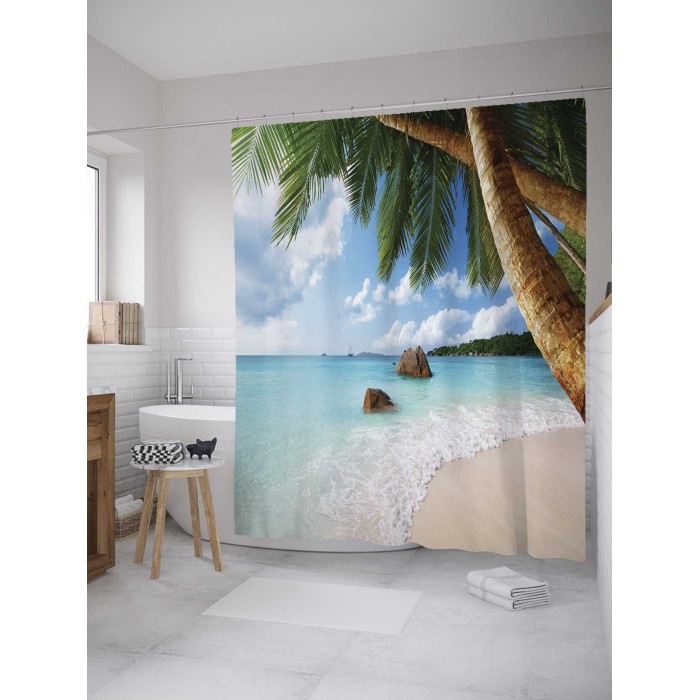 - Модель: Штора-занавеска для ванной из сатена с крючками На дальних берегах 200х180 см