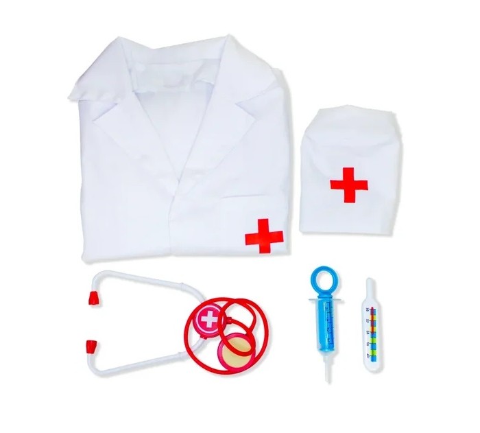В наборе халат с воротником и карманом, отделан декоративным красным крестом. Неотъемлемой частью гардероба настоящего доктора является также колпак, украшенный красным крестом.