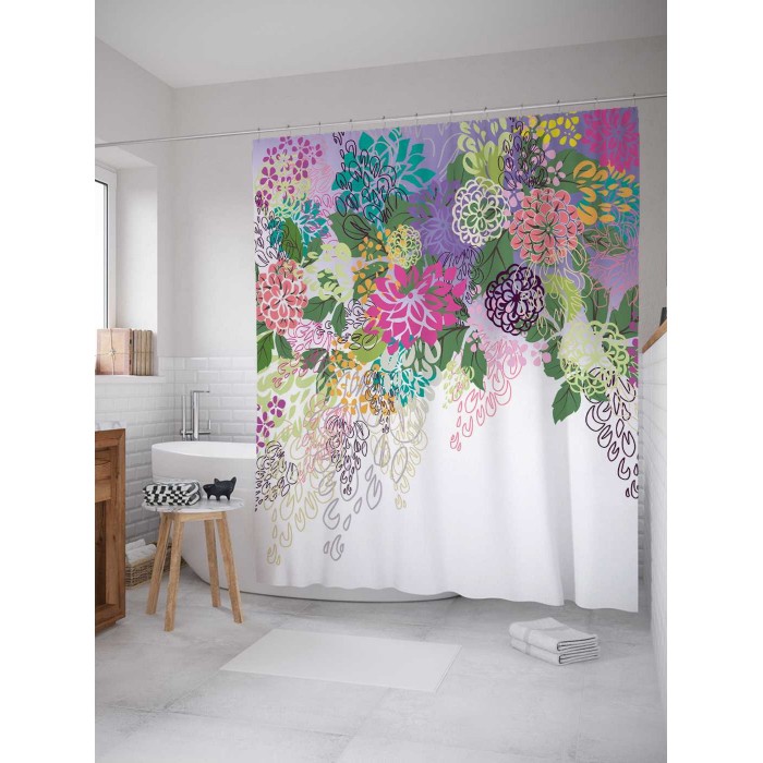 Красиво декорированная шторка, защищающая пол и оборудование ванной комнаты от брызг воды, изготовлена из полиэстера и обладает выраженными водоотталкивающими свойствами.