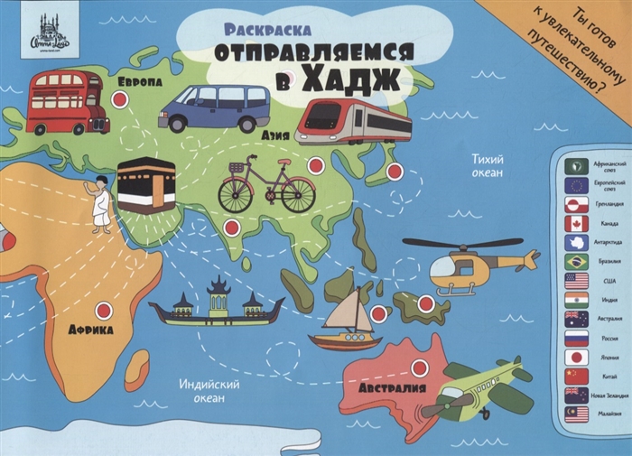 В раскраске представлены разные виды транспорта. Помогает в изучении географии. Основная мысль данного пособия это то, что все мусульмане всего мира стремятся к совершению Хаджа, это раскраска о том, что мусульмане направляются к Священному месту с разных уголков Земли на разном транспорте.