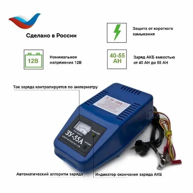 ЗУ предназначено для заряда АКБ емкостью от 40 до 55 А. ч.Заряд аккумулятора происходит автоматически.При заряде АКБ до 14,2В происходит отключение ЗУ. После саморазряда АКБ до 13,5В ЗУ самостоятельно вступает в работу и производит заряд АКБ до 14,2В.ЗУ позволяет длительное время поддерживать АКБ в заряженном состоянии (зимний период). Не требует дополнительных вмешательств.номинальное выходное постоянное напряжение, при заряде током 5А - 14 + 1,0В.номинальный постоянный выходной ток (ток заряда) 3 ± 1,0Аноминальная потребляемая мощность при токе заряда 5А, не более 70 Вт.масса в комплекте с соединительными проводами, не более - 2,2 кг.габаритные размеры не более 275х145х105 мм.