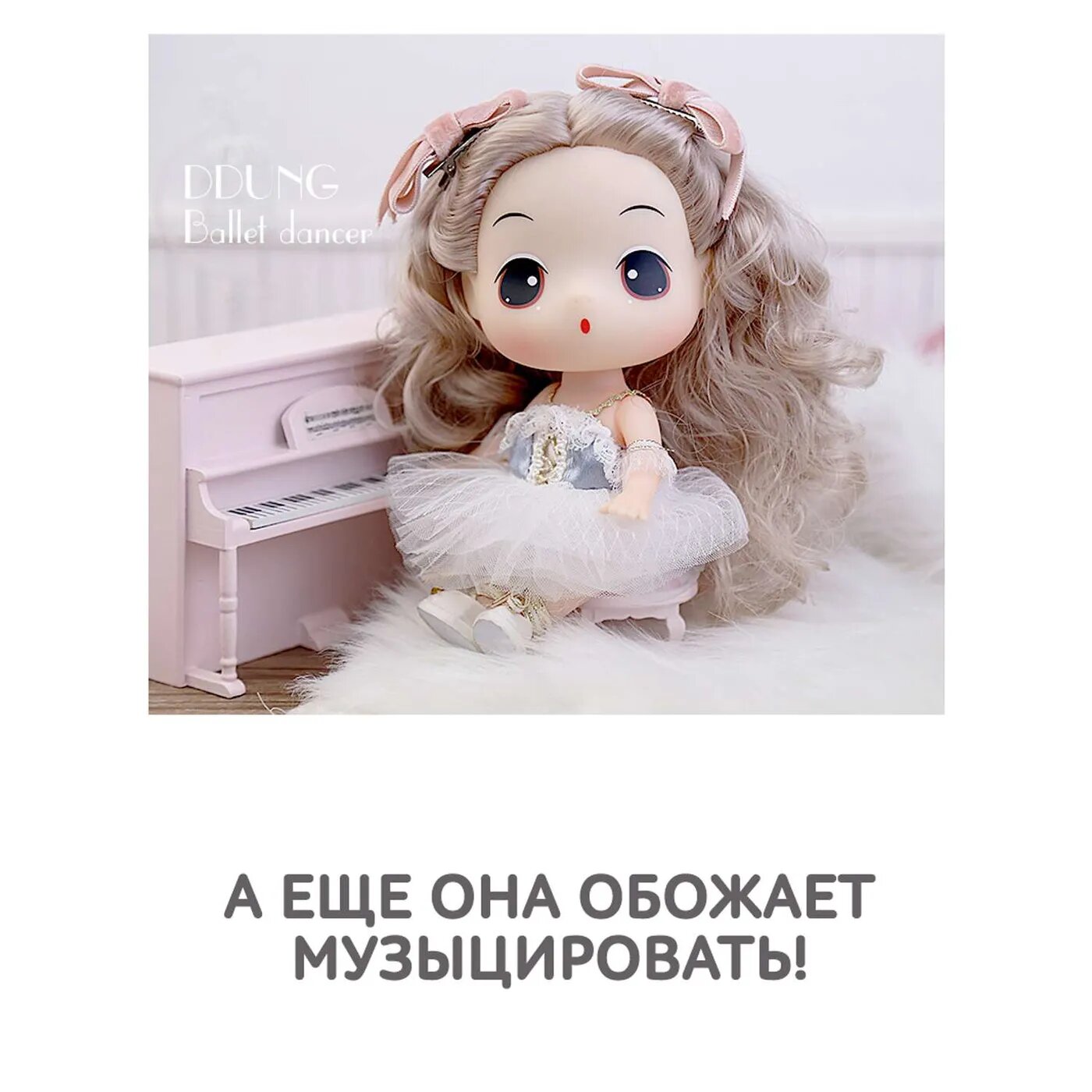 Кукла DDUNG (Корея)-обаятельное создание. Кукла балерина. Она как принцесса-милое личико, пухлые щечки, большие глаза. Длинные кудрявые волосы, из которых можно сделать любую прическу. Кукла пупс DDUNG-юная кокетка и модница. Ее девиз: Быть хорошей-значит быть красивой. Голова куклы вращается на 360°. Руки и ноги куклы подвижные. Одежда для кукол и обувь всегда модные и стильные, их можно снять и одеть другое платье для кукол.