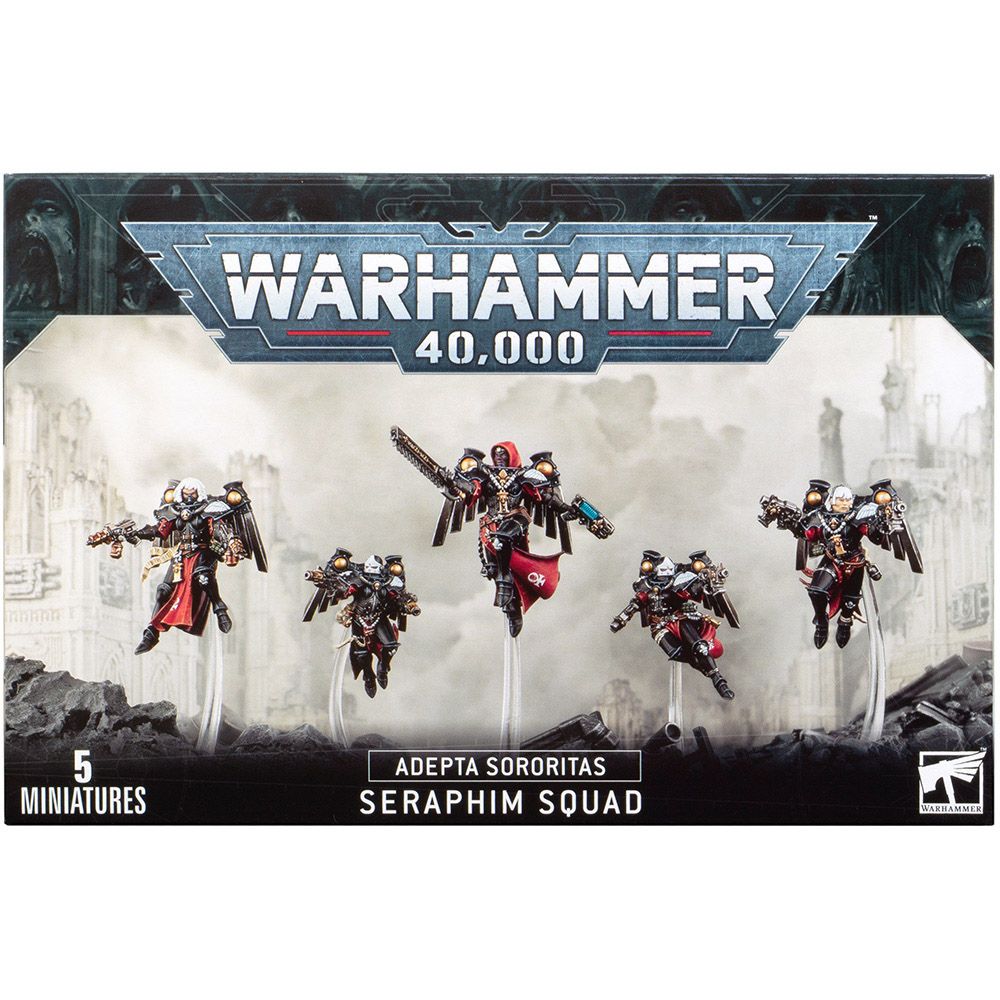 Ангельские воины, известные как Серафимы, сражаются в авангарде армии Адепта Сороритас. Оснащенные прыжковыми ранцами образца Сан-Леор, они спускаются с высоты и бросаются на вражеские позиции, используя шок и трепет, чтобы разрушить строй, прежде чем их собратья-Сестры откроют огонь. Каждый Серафим владеет парой пистолетов, выбранных из святой троицы видов оружия. Болт-пистолеты используются для смертоносного града, когда Серафимы описывают дугу в небе, ручные огнеметы извергают потоки огня, уничтожая плотные ряды врагов, в то время как инферно-пистолеты стреляют сфокусированными тепловыми лучами, которые с презрительной легкостью расплавляют броню и плоть. Набор создает пять Серафимов. Каждый Серафим носит по два болт-пистолета, хотя двое из их числа могут быть вооружены ручными огнеметами, в то время как еще двое могут носить инферно-пистолеты. Одна модель может быть собрана как Высший Серафим, вооруженный болт-пистолетом или плазменным пистолетом в одной руке и болт-пистолетом на выбор, цепным мечом или силовым мечом в другой. Этот набор поставляется в 107 пластиковых деталях и содержит 5 комплектов круглых оснований Citadel диаметром 32 мм и 2 комплекта стержней с пазами Citadel диаметром 45 мм. Также прилагается переводной лист Адепта Сороритас.