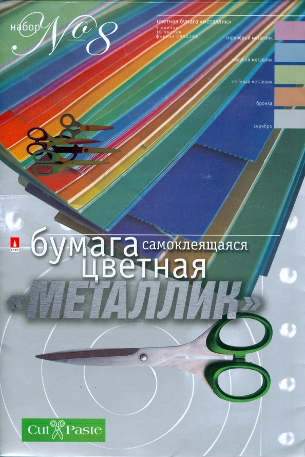 Бумага цветная самоклеящаяся, односторонняя. Формат: 195х288 мм. Количество листов: 10. Количество цветов: 5. Наименование цветов: сиреневый металлик, голубой металлик, зеленый металлик, бронза, серебро.