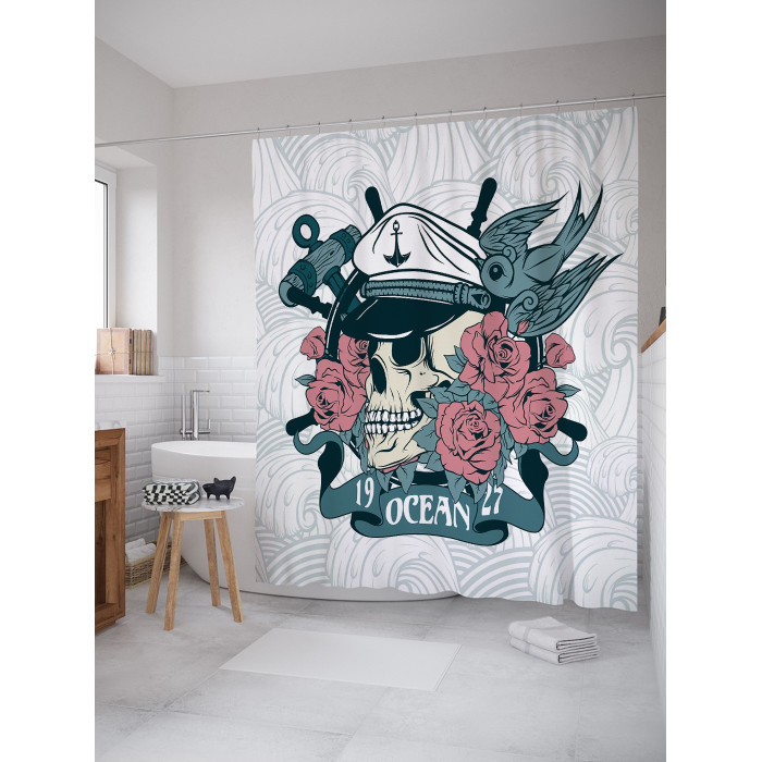 - Модель: Штора занавеска для ванной Капитанский череп в розах из сатена 180х200 см с крючками