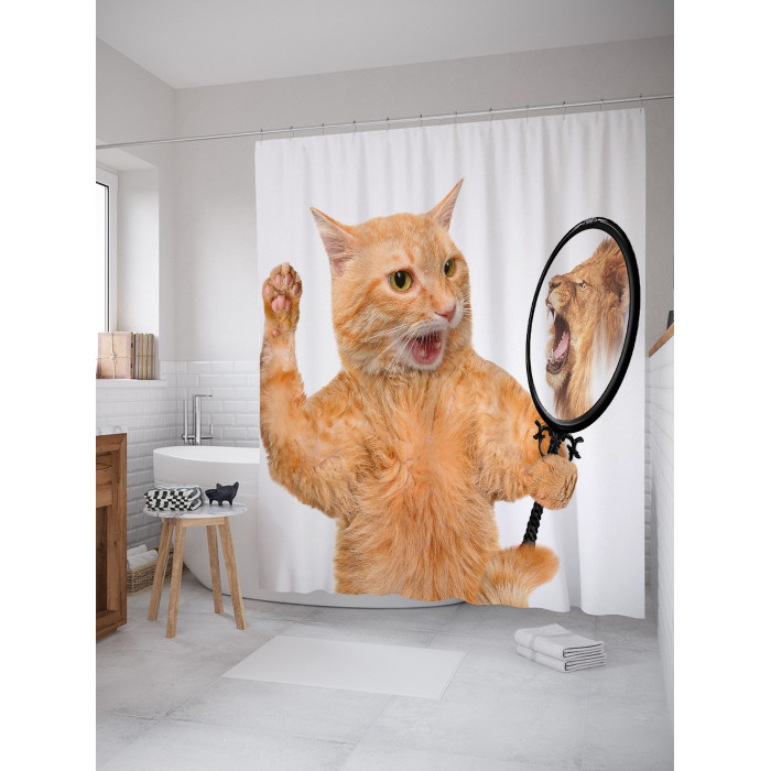 Шторка-занавеска для ванной JOYARTY Штора занавеска для ванной Кот видит льва из сатена 180х200 см с крючками