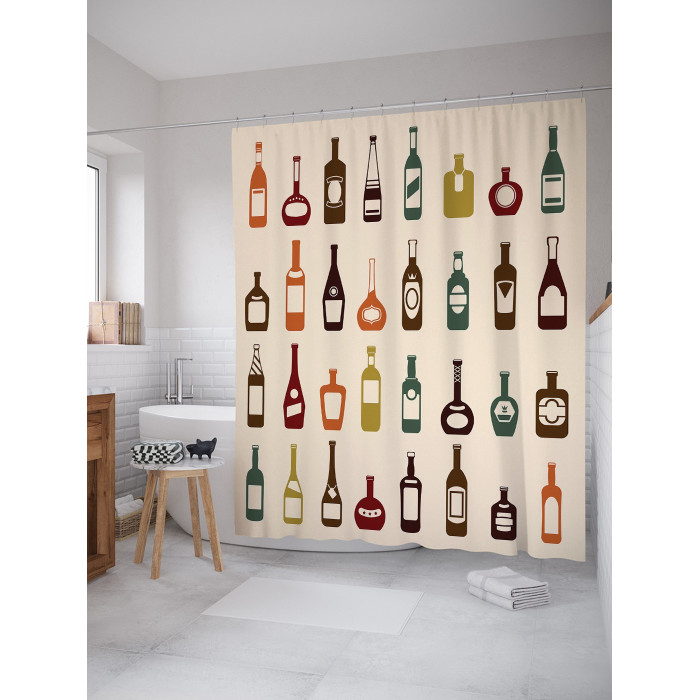 - Модель: Штора занавеска для ванной Множество алкоголя из сатена 180х200 см с крючками