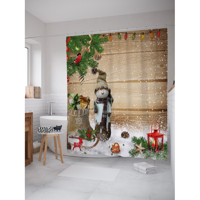 Шторка-занавеска для ванной JOYARTY Штора занавеска для ванной Обаятельный снеговик из сатена 180х200 см с крючками