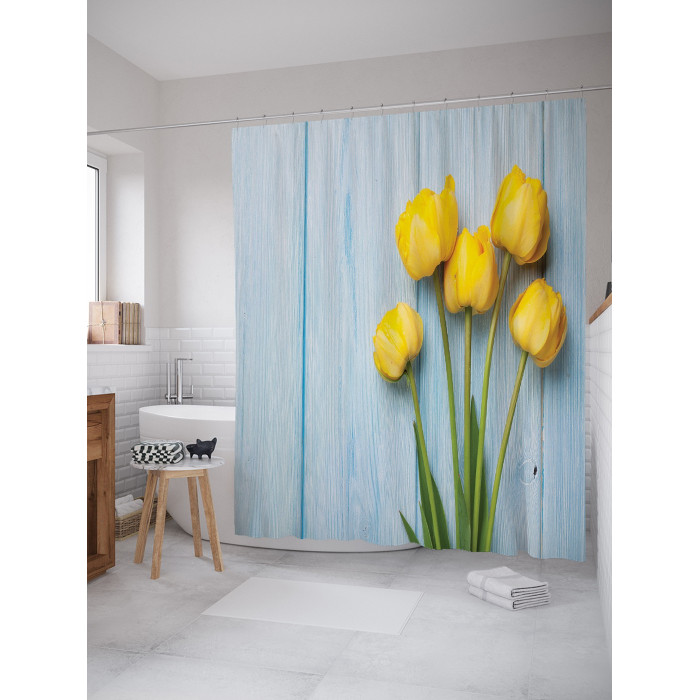 - Модель: Штора занавеска для ванной Желтые тюльпаны на деревянных досках из сатена 180х200 см