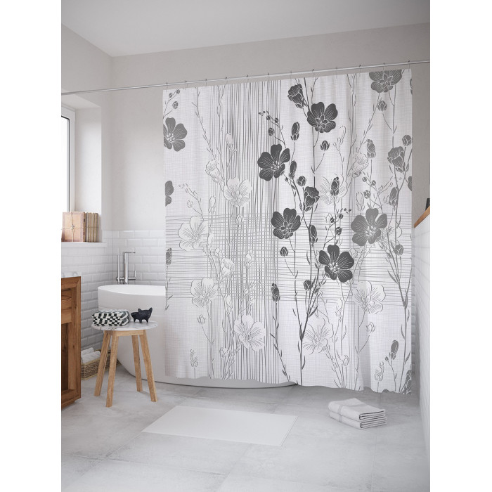 Комплектация: шторка для ванной 180х200 см, крючки – 12 шт. Материал: сатен; состав: полиэстер 100%. Плотность: 80 гр/кв.м.