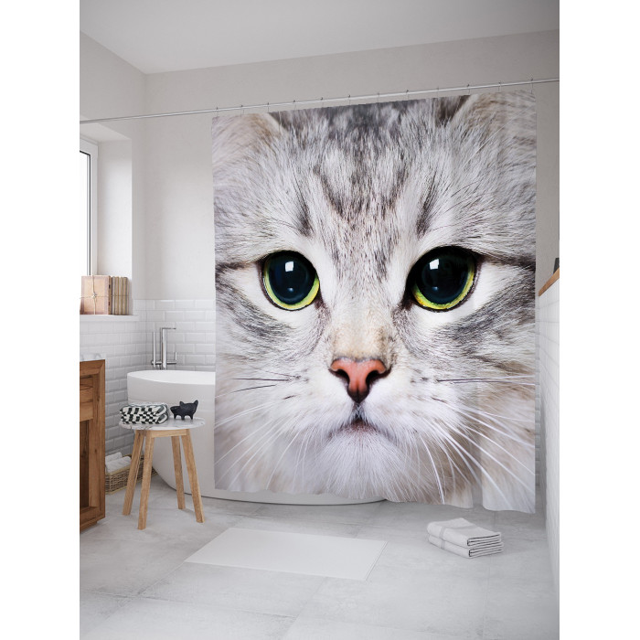 - Модель: Штора занавеска для ванной Суровый котик из сатена 180х200 см с крючками