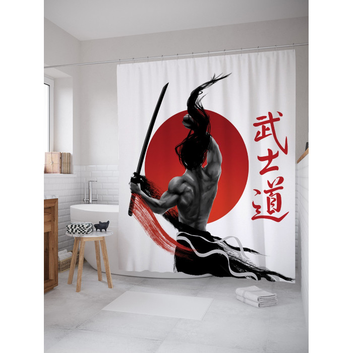 - Модель: Штора занавеска для ванной Самурай на закате из сатена 180х200 см с крючками