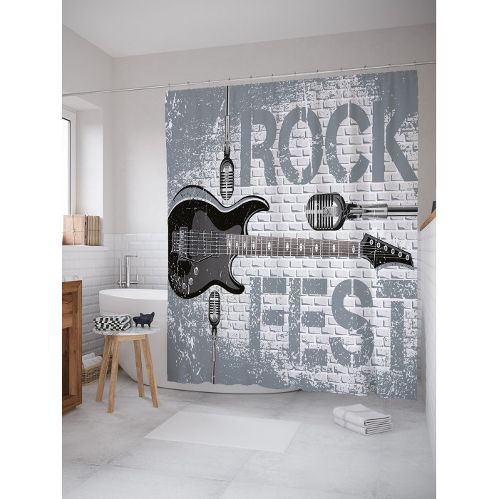 - Модель: Штора занавеска для ванной Гитара и микрофоны из сатена 180х200 см с крючками