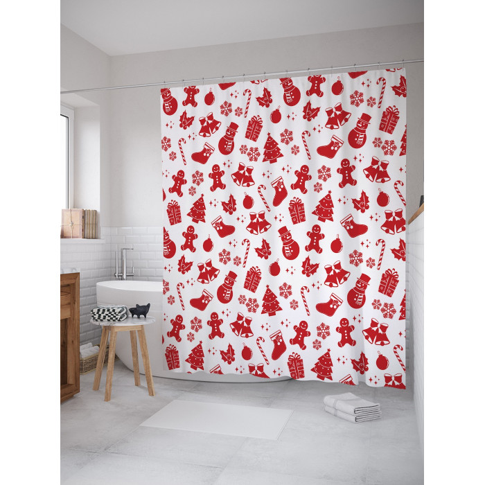 - Модель: Штора занавеска для ванной Новогодние атрибуты из сатена 180х200 см с крючками