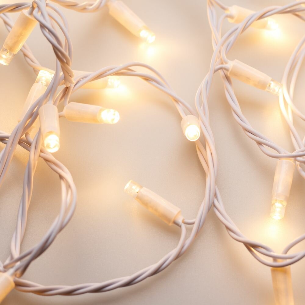 Светодиодная гирлянда "НИТЬ" серии Classic. Длина 10000 мм. Цвет светодиодов ТЕПЛЫЙ БЕЛЫЙ (3000К). Материал провода - белый ПВХ. Диаметр провода 2.3 мм. Количество светодиодов 100 шт. Постоянное свечение. Размер светодиодов 7 мм с вогнутой внутрь линзой и защитным колпачком. Напряжение питания DC 230V, потребляемая мощность 7W. Степень защиты от воздействия окружающей среды IP65. Температурный режим работы от -30 градусов до +40 градусов по Цельсию. Предусмотрена возможность соединения 150 метров между собой без дополнительных аксессуаров. Для подключения одной гирлянды или нескольких гирлянд к сети необходимо приобрести провод питания с выпрямителем AC/DC.