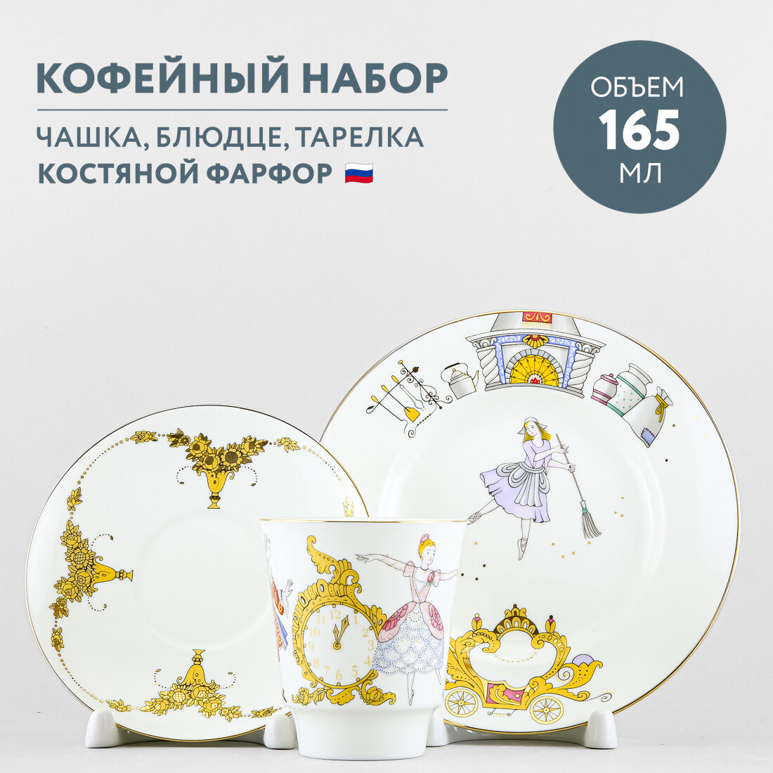Трехпредметный комплект «Золушка» на форме «Майская» из серии «Русский балет»: чашка, блюдце и тарелка.