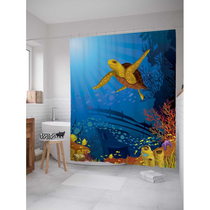 - Модель: Штора занавеска из сатена с крючками Черепаха на океанском дне 200х180 см