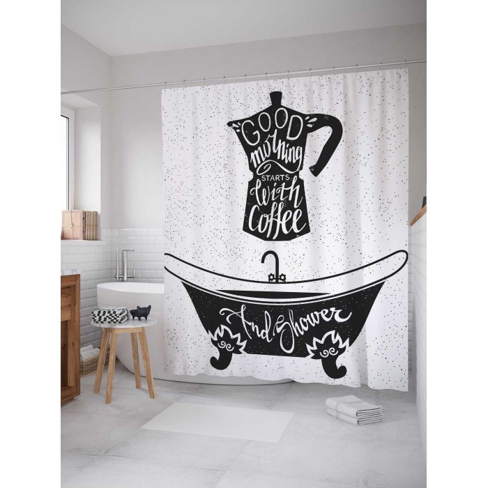 Шторка-занавеска для ванной JOYARTY Штора-занавеска для ванной из сатена с крючками Утренний душ и кофе 200х180 см (размер: 180х200)