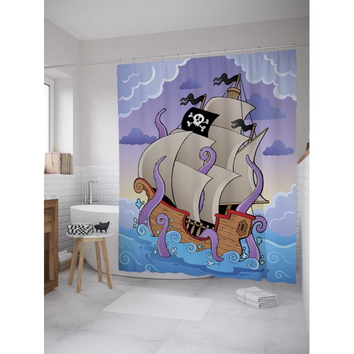 - Модель: Штора-занавеска для ванной из сатена с крючками Пиратский корабль с осьминогом 200х180 см