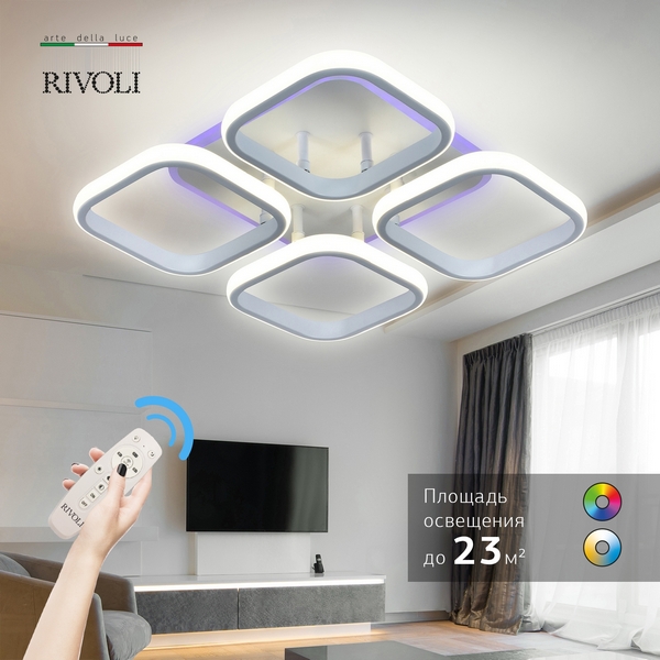 Потолочная люстра светодиодная с пультом регулировкой цветовой температуры и яркости Hilde RGB - продукт известной компании Rivoli (Италия). Имеет максимальную мощность 60 Вт, освещает площадь до 12 кв. м. Отлично подойдет для таких мест, как гостиная, холл, спальня, кабинет, офис. Впишется в интерьеры следующих стилей: модерн.