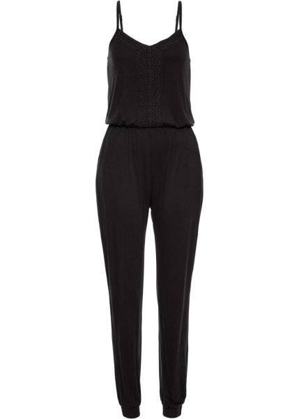 Непринужденный трикотажный комбинезон с резинками в талии и по нижнему краю брючин. Регулируемые бретели. Два втачных кармана. Верх отделан вязаным кружевом. Длина по внутреннему шву ок. 71,5 см (разм. 36/38).