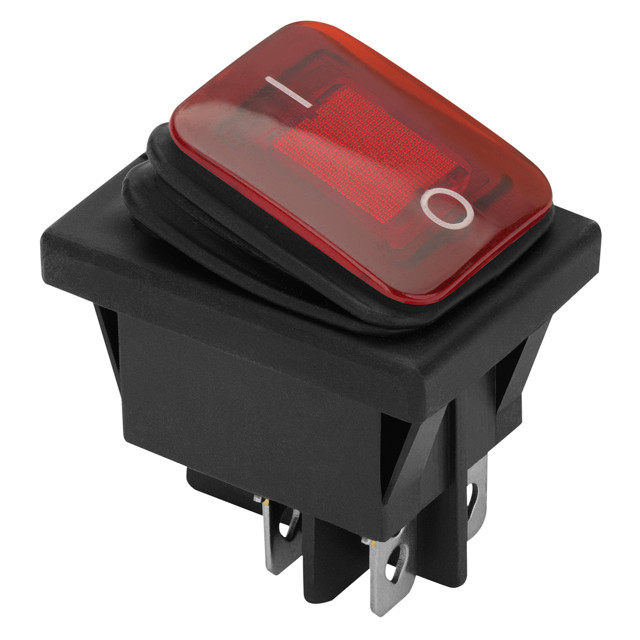 **Выключатель клавишный с подсветкой** — Выключатель клавишный ON-OFF красный с подсветкой предназначен для коммутации электрических цепей переменного тока напряжением до 250В. Клавишные выключатели применяются в качестве комплектующих изделий различного электрооборудования (в сетевых фильтрах и удлинителях, аудио-оборудовании, блоках питания, электроустановках на различных производствах, автомобилях, и многих других местах). Такой клавишный переключатель имеет два положения. Принцип действия основан на перемещении клавиши в одну из позиций. Для переключения в нужное положение требуется приложить некоторые усилия на клавишу.