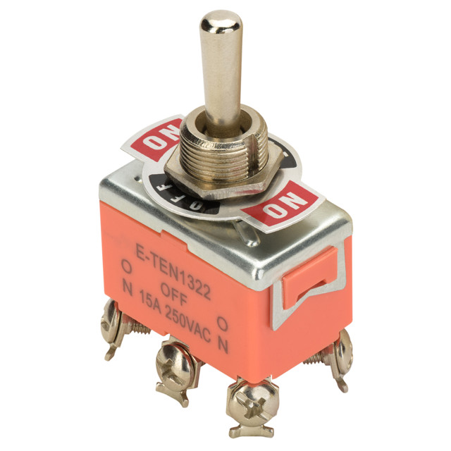 **Тумблер** — Тумблер применяется в радиоэлектронике для коммутации электроцепей постоянного и переменного тока напряжением до 250В и обеспечивающее требуемый рабочий режим. Металлический перекидной переключатель имеет 3 типа переключения ON-OFF-ON. Подключение контактов осуществляется с помощью винтов.Такая разновидность переключателей применяется на лицевых панелях в качестве комплектующих изделий различного электрооборудования (в измерительных приборах, блоках питания, электроустановках на различных производствах, легковых и грузовых автомобилях, поездах и многих других местах).