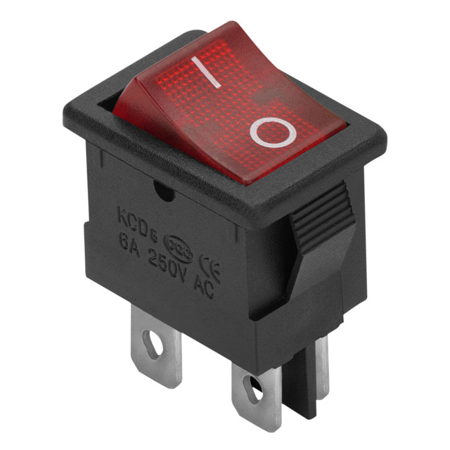 Выключатель клавишный с подсветкой — Выключатель клавишный ON-OFF красный с подсветкой предназначен для коммутации электрических цепей переменного тока напряжением до 250В. Клавишные выключатели применяются в качестве комплектующих изделий различного электрооборудования (в сетевых фильтрах и удлинителях, аудио-оборудовании, блоках питания, электроустановках на различных производствах, автомобилях, и многих других местах). Такой клавишный переключатель имеет два положения. Принцип действия основан на перемещении клавиши в одну из позиций. Для переключения в нужное положение требуется приложить некоторые усилия на клавишу.