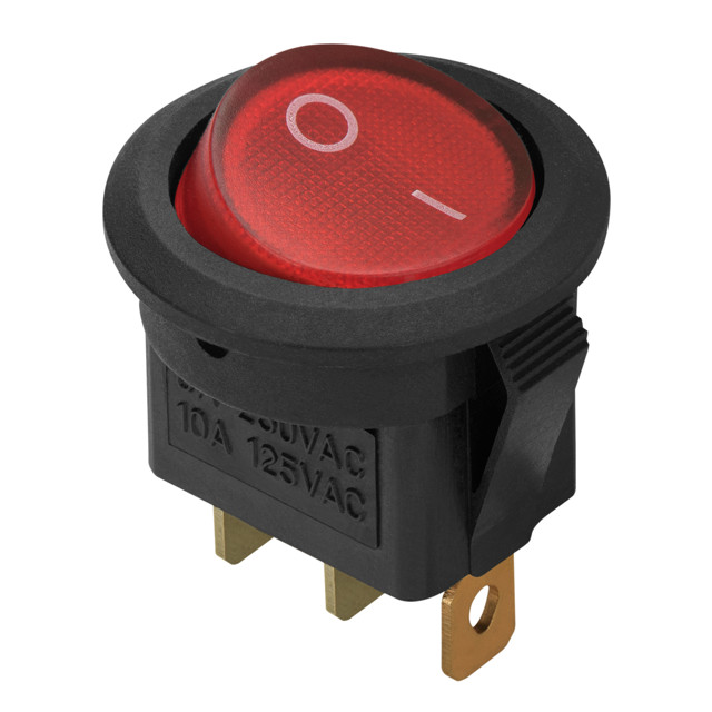 Выключатель клавишный с подсветкой — Выключатель клавишный ON-OFF красный с подсветкой предназначен для коммутации электрических цепей переменного тока напряжением до 250В. Клавишные выключатели применяются в качестве комплектующих изделий различного электрооборудования (в сетевых фильтрах и удлинителях, аудио-оборудовании, блоках питания, электроустановках на различных производствах, автомобилях, и многих других местах). Такой клавишный переключатель имеет два положения. Принцип действия основан на перемещении клавиши в одну из позиций. Для переключения в нужное положение требуется приложить некоторые усилия на клавишу.